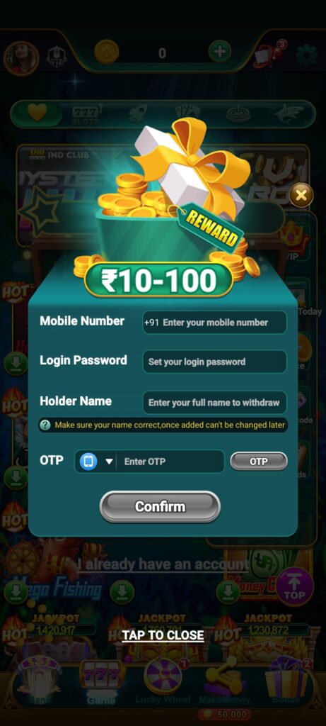 Aapko click karte hi 4 digit ka otp send Kiya jaenga. Aap us otp ko niche diye gaye Khali option me darj karke confirm button par click kar sakte hain. Click karte hi aapko singup bonus ₹10-100 rupay ka login bonus prapt kar sakte hain.