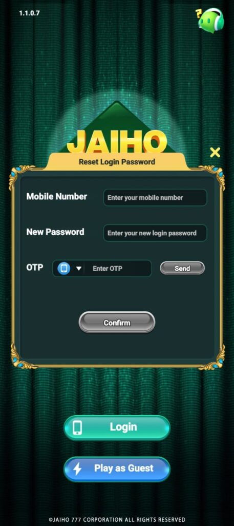 Jaiho 777 ऐप में आपको लॉगिन बोनस ₹78 रुपये का फ्री बोनस आपको मिलेगा। याह ऐप में आपको अपना 10 अंकों का नंबर दर्ज करके लॉगिन पासवर्ड सेट करना होगा। उसके बाद मुझे आपके अपने धारक का नाम दर्ज करके ओटीपी बटन पर क्लिक करना होगा, आपको अंकों का ओटीपी भेजना होगा। आपको हमारे ओटीपी को खाली बॉक्स में दर्ज करके ऐप पर सिंगिन बोनस प्राप्त करना है।