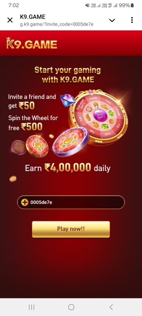 K9 Game Apk Download {Singup Bonus ₹500}Cash out ₹150