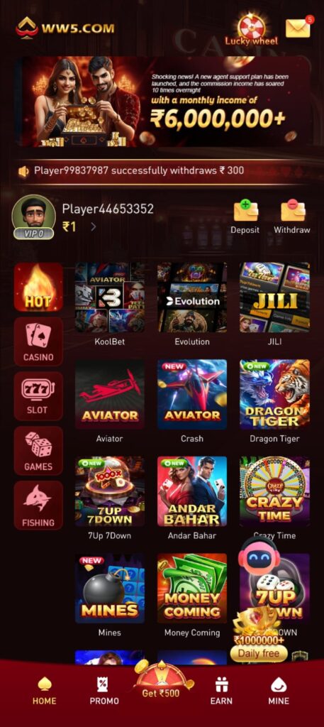 Friends, in this application you can withdraw more than the minimum withdrawal of ₹ 110 from your bank account. And you will get very good winnings in this application. You can earn more than ₹ 2500 daily by joining this app and playing games.